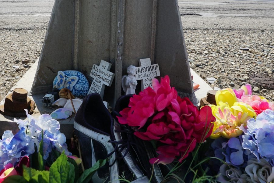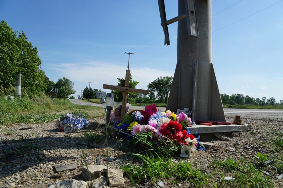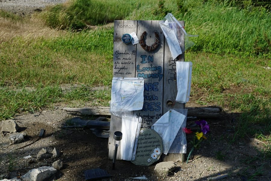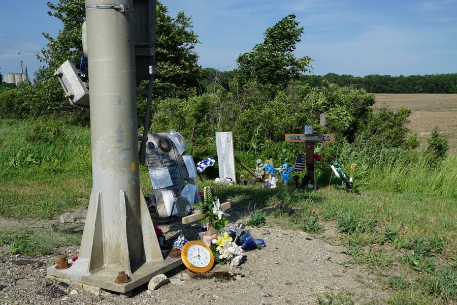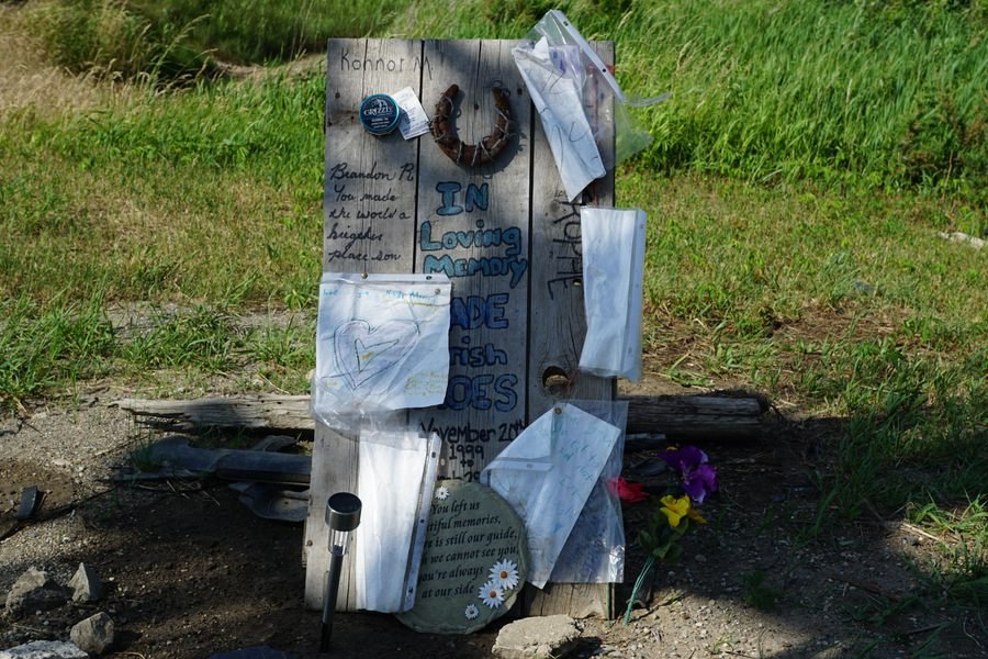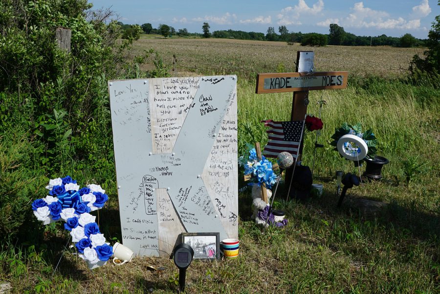 In June, Polly and I found ourselves in Reading, Michigan — a town of 1,100 people. On March 29, 2016, 16-year-old Kade Moes, a junior at the local high school, was killed in an automobile accident after he drove off the road and hit a metal railroad crossing pole. After the accident, an impromptu roadside memorial was put up at the site of the fatal crash. The cross with Kade’s name has the word Katastrophe. Kade was a Mixed Martial Arts (MMA) fighter and his nickname was Katastrophe. Kade fought in the flyweight division, sporting a 4-0 record at the time of his death.